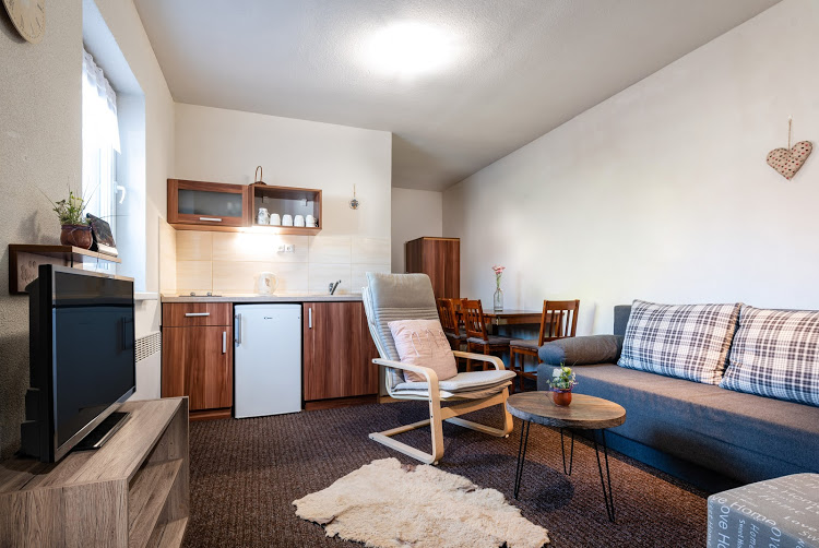 V apartmáne na prízemí je veľká obývačka s kuchynským a jedálenským kútom, samostatná kúpelňa a spálňa vybavená manželskou posteľou. Na poschodí je loft pre 3 ľudí. Kuchyňa je vybavená elektrickým varičom, mikrovlnkou, rýchlovarnou kanvicou,kávovar,kompletný kuchynský a jedálenský servis a chladničkou s mraziakom. V obývačke je tiež možnosť rozťahovacieho gauču. V apartmáne je 5 lôžok a možnosť prísteľky pre 2 osoby. K dispozícii je detská stolička,postieľka, hračky pre deti a sušiak na prádlo. Pri dome je vlastné posedenie s možnosťou grilovania,aj altánok. Parkovanie pri dome. WIFI.